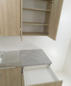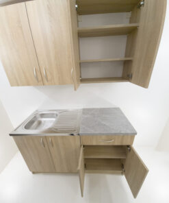 Pastatomos ir pakabinamos virtuvės spintelės su kriaukle komplektas, puikiai tiksiantis nedidelei virtuvėlei. Spintelių gamybai naudojama 18mm laminuota medžio drožlių plokštė, sudėta laiko patikrinta kokybiška furnitūra. Švelniai užsidarančios durelės bei stalčius. Komplektas parduodamas su kriaukle ir stalviršiu.